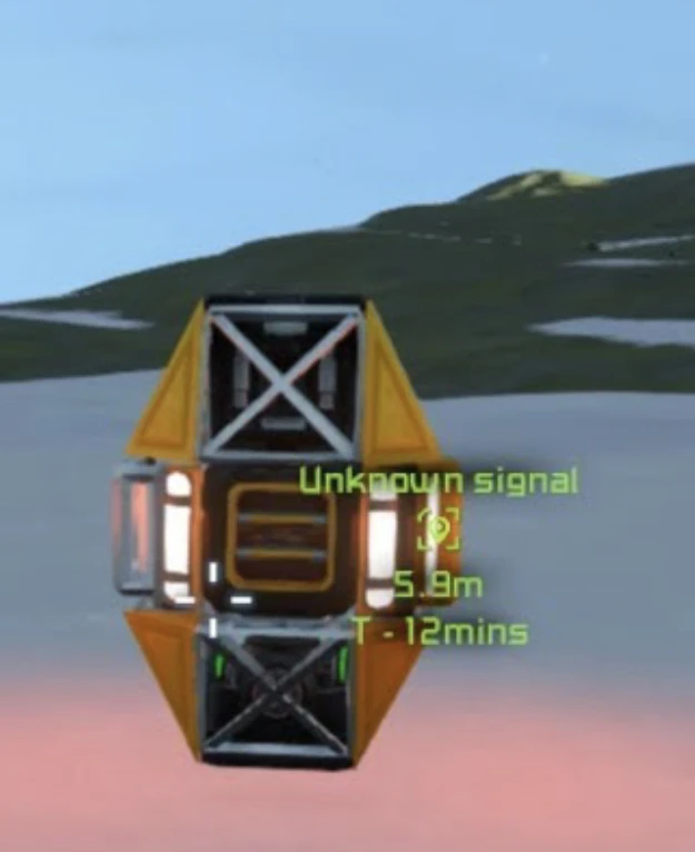 Strong unknown signals are a bit larger and appear only in multiplayer games, in space. They typically spawn far away from you, requiring space flight to reach them, because they spawn within 50 kilometres of any player. All players who have signals enabled on their HUD are alerted to these cargo drops with a yellow signal.